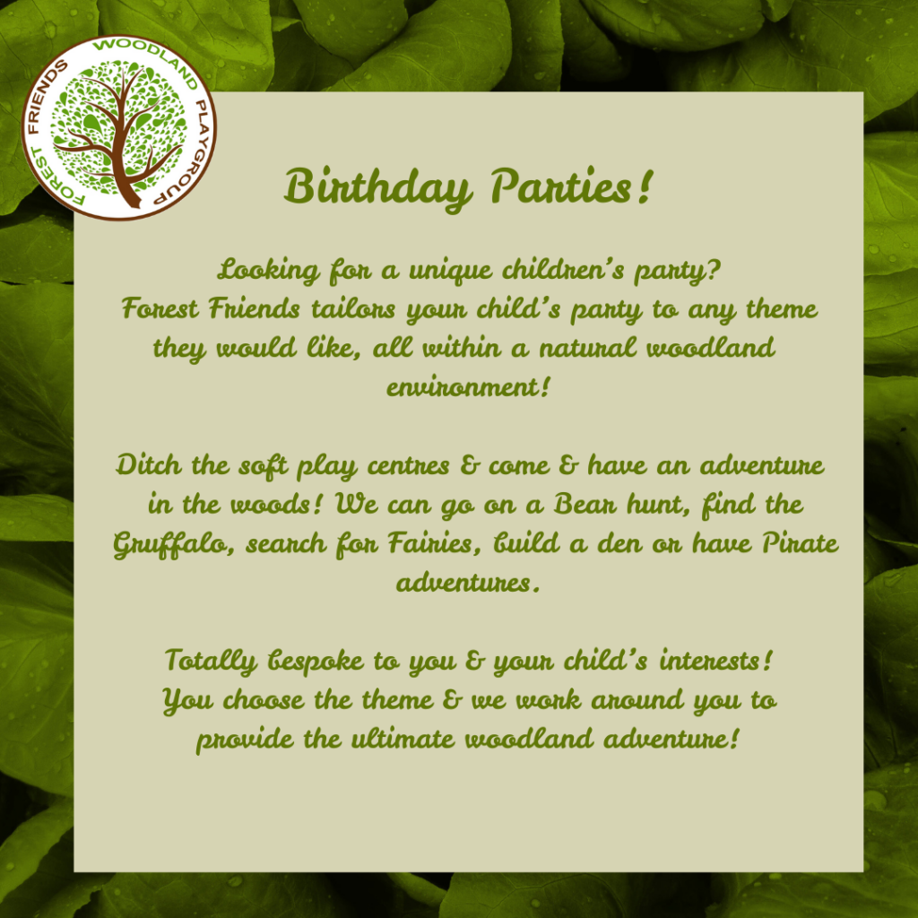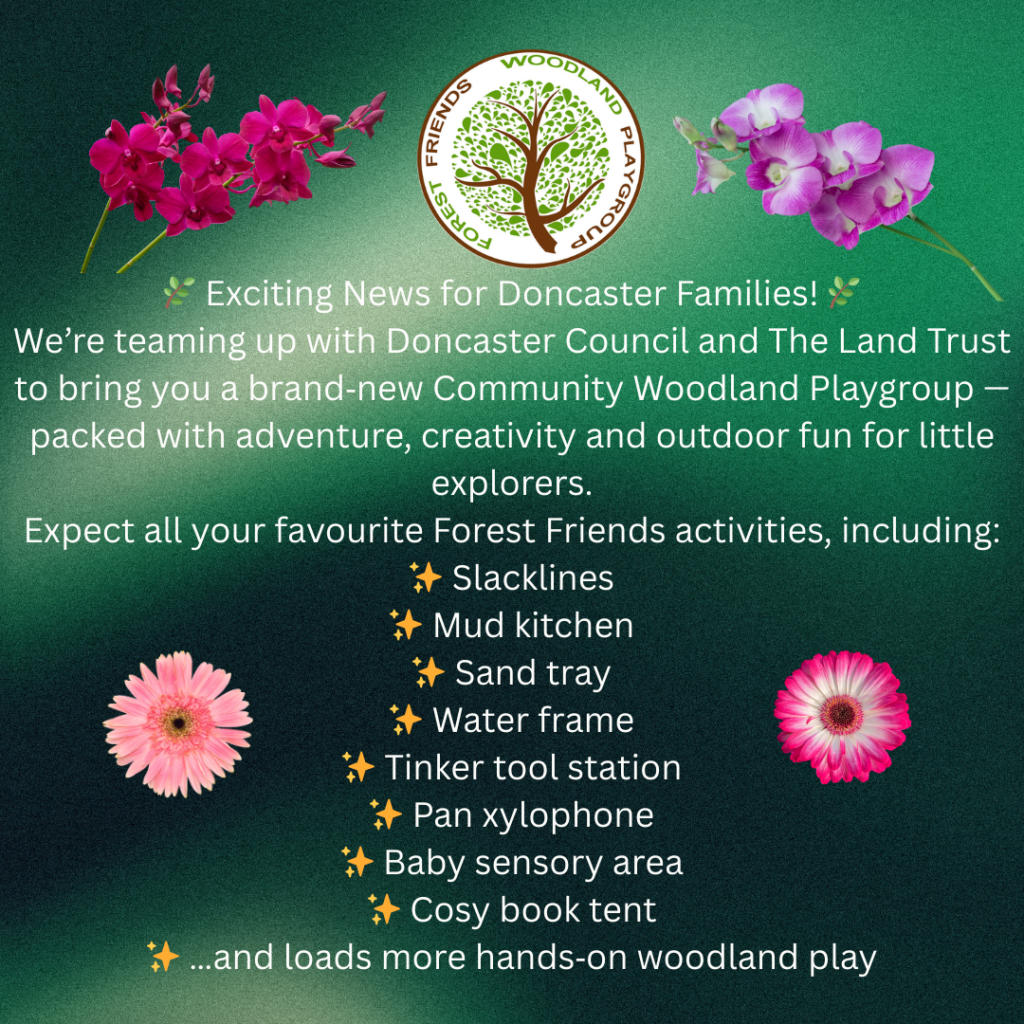 Forest Friends is based at Squirrel Wood, Doncaster, DN6 9JQ and offers a completely outdoor playgroup, weekly classes, Forest School Sessions, birthday parties and story trails; with a variety of activities including mud kitchen, bug hunting, rope swings, den building, hammock, crafts and much more!