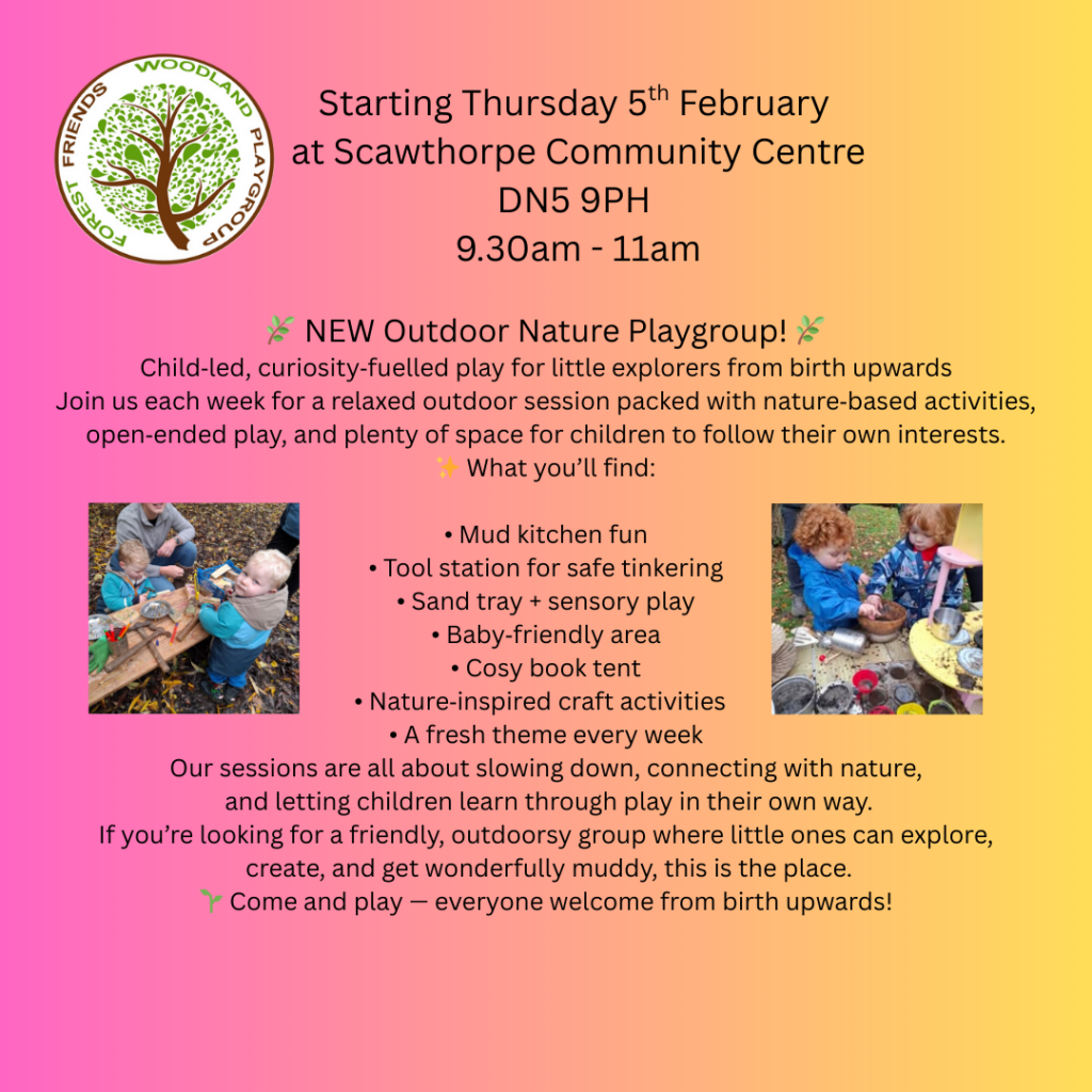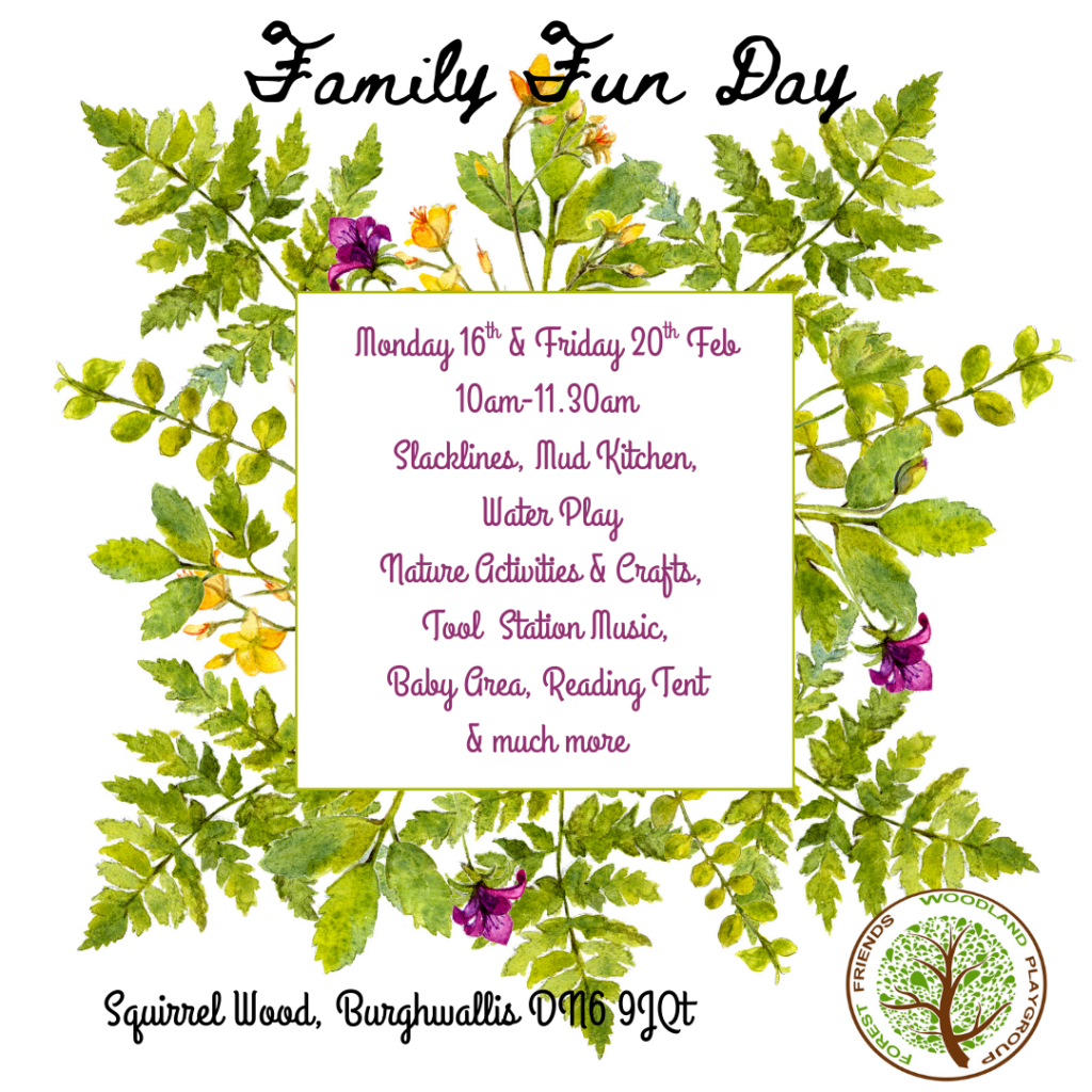 Forest Friends is based at Squirrel Wood, Doncaster, DN6 9JQ and offers a completely outdoor playgroup, weekly classes, Forest School Sessions, birthday parties and story trails; with a variety of activities including mud kitchen, bug hunting, rope swings, den building, hammock, crafts and much more!
